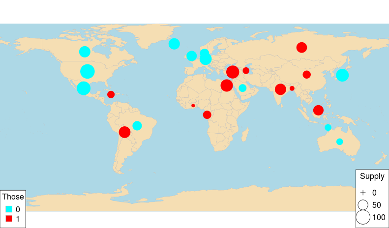 mapBubbles(dF=country, nameZSize="Supply", nameZColour="Those", colourPalette="rainbow", oceanCol="lightblue", landCol="wheat")