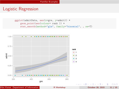 I am preparing presentations for the upcoming R workshop. That means I have to find a way to integrate R code and results into my presentations. Now I know there are a number of ways to achieve this, but I like beamer for presentations and R for analysis. Now thanks to Knitr, I can bring together my two most favorite pieces of software.