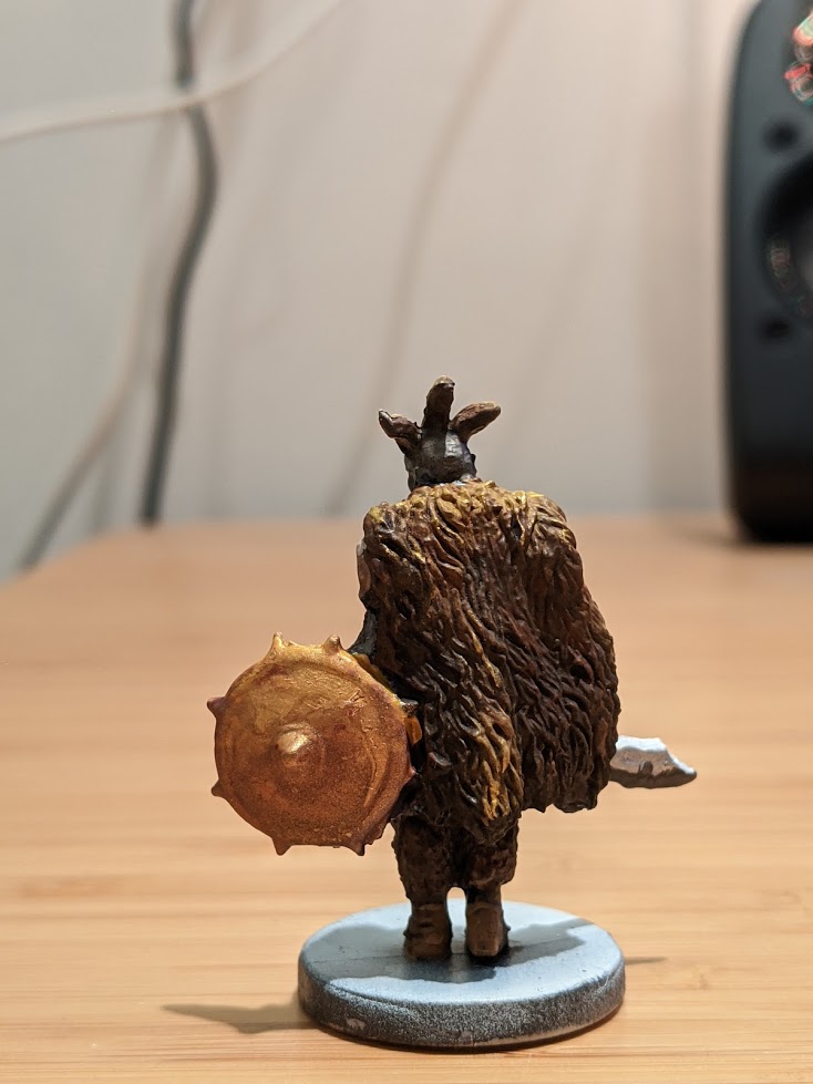 This was the first mini I used wet blending on with some success. The fur cloak turned out to be better than I expected. Perhaps I should have started with a lighter tone for the highlight areas… I had to touch up with pure yellow to make the contrast apparent.