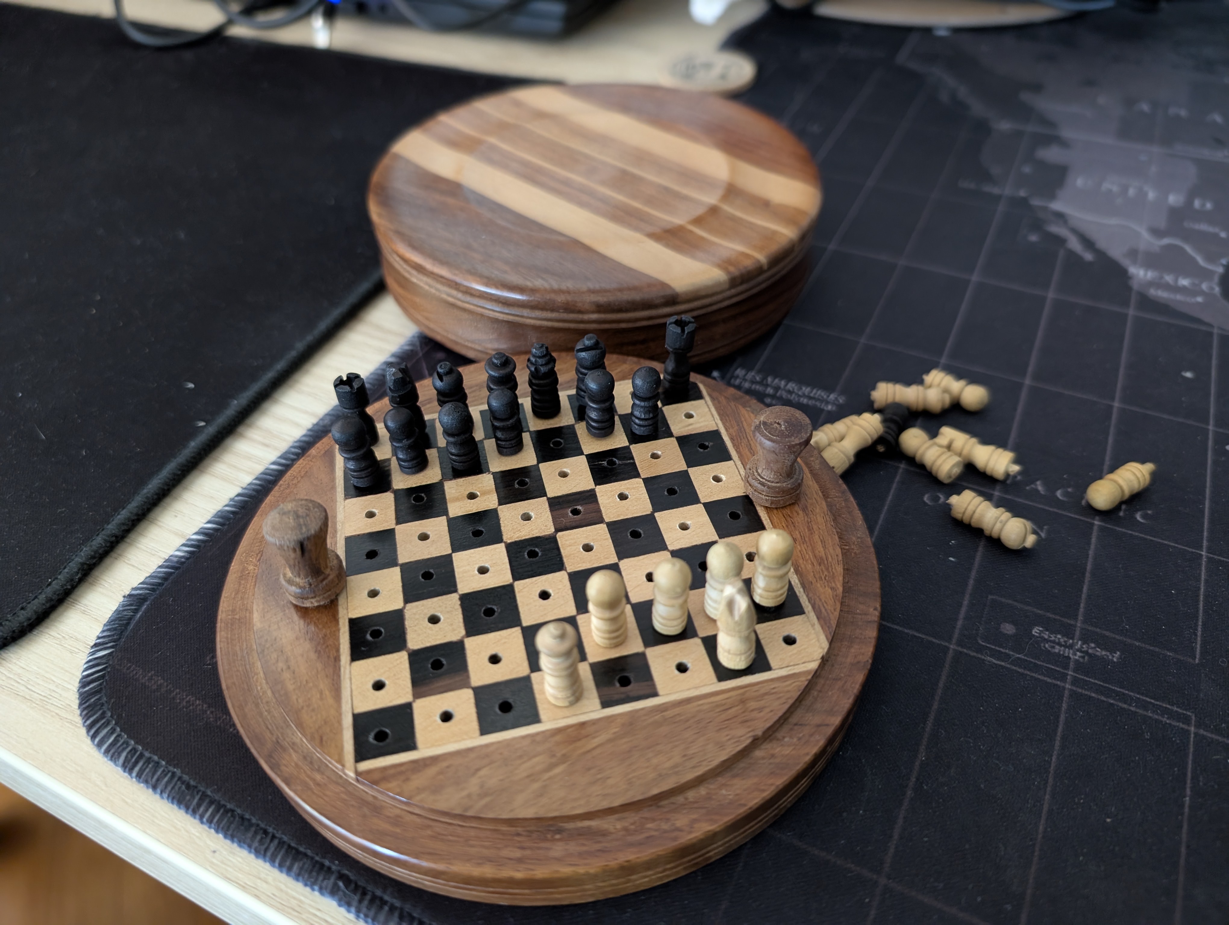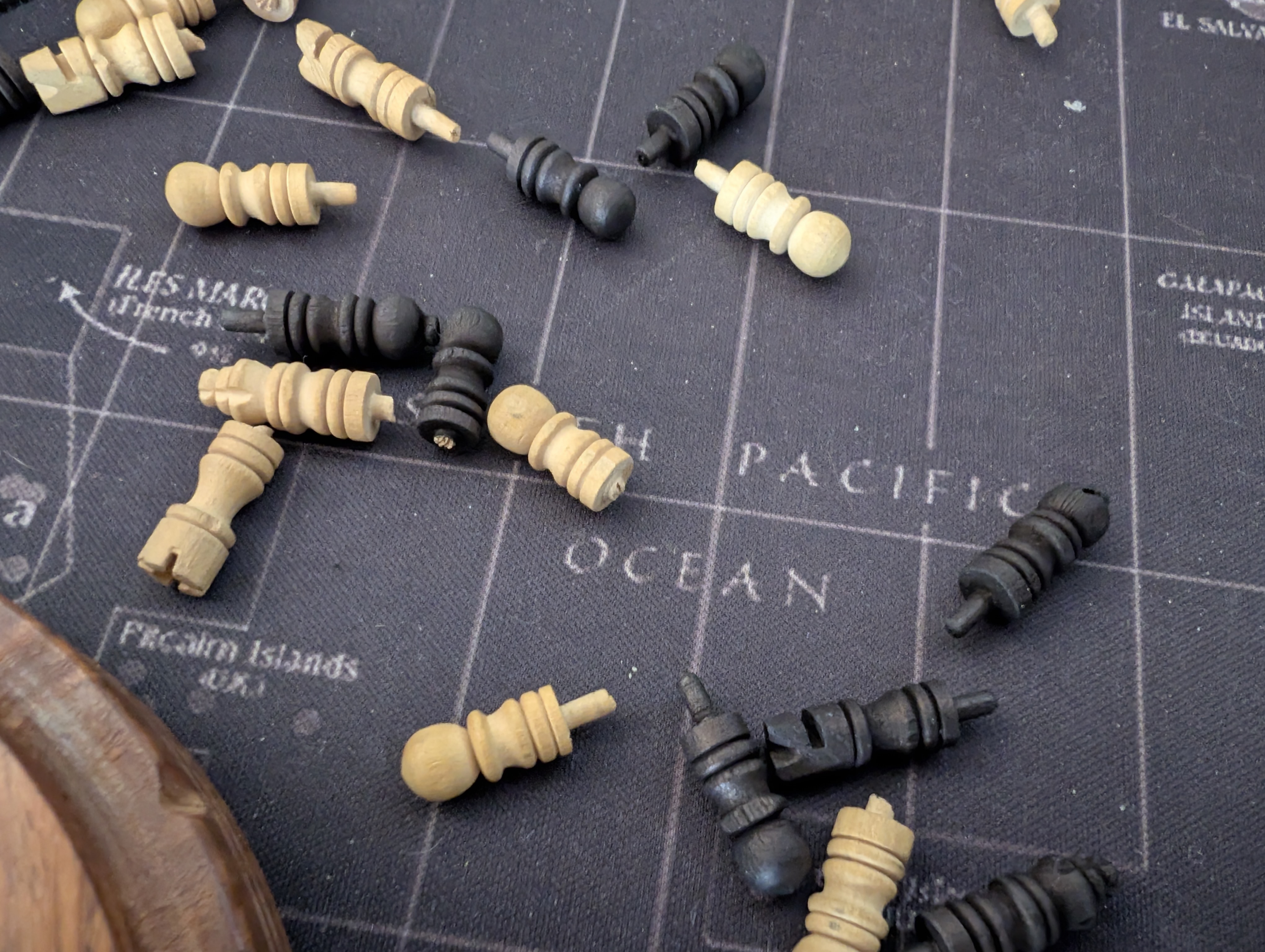The chess set was a gift from Snow White… It was a miniature travel chess set, hand made, very delicate. The pieces were held in place with tiny pegs going into tiny holes in the board. Over the years a few pieces got lost, and others broke. Worst was the pegs that broke in those tiny holes.