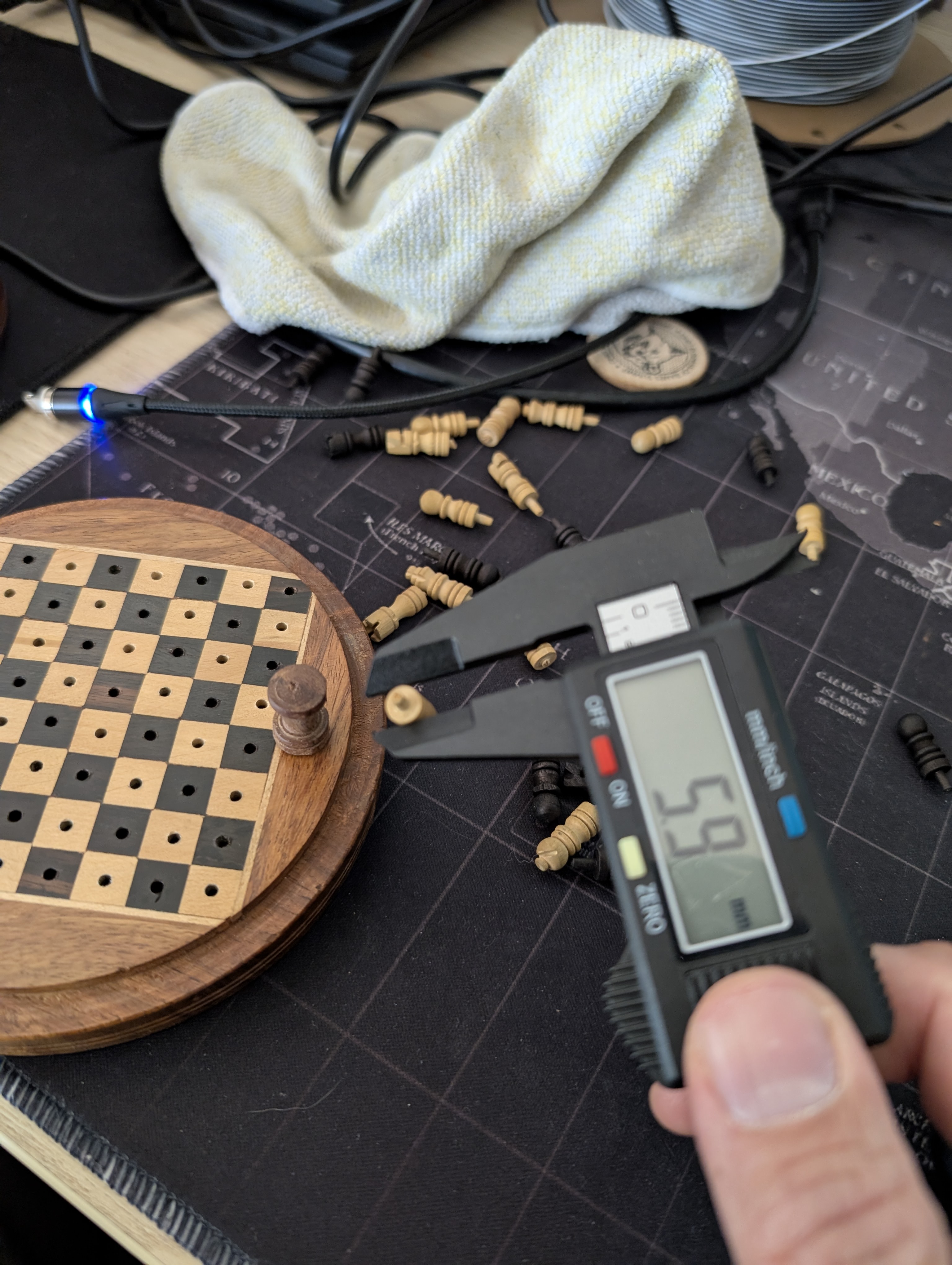 So I started with drilling those pegs out. That left me with the problem of missing pieces and broken pieces. So I decided to 3D print replacements. I took this micro chess set here. It was looking good, but missing the pegs, it was also a tad too big. So I opened it up in tinkercad, scaled it down and added the pegs.